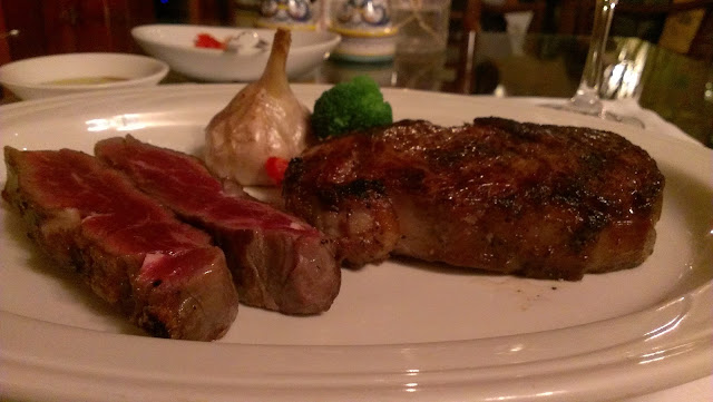 肋眼外層帶著焦味,配上烤過的大蒜,很棒!